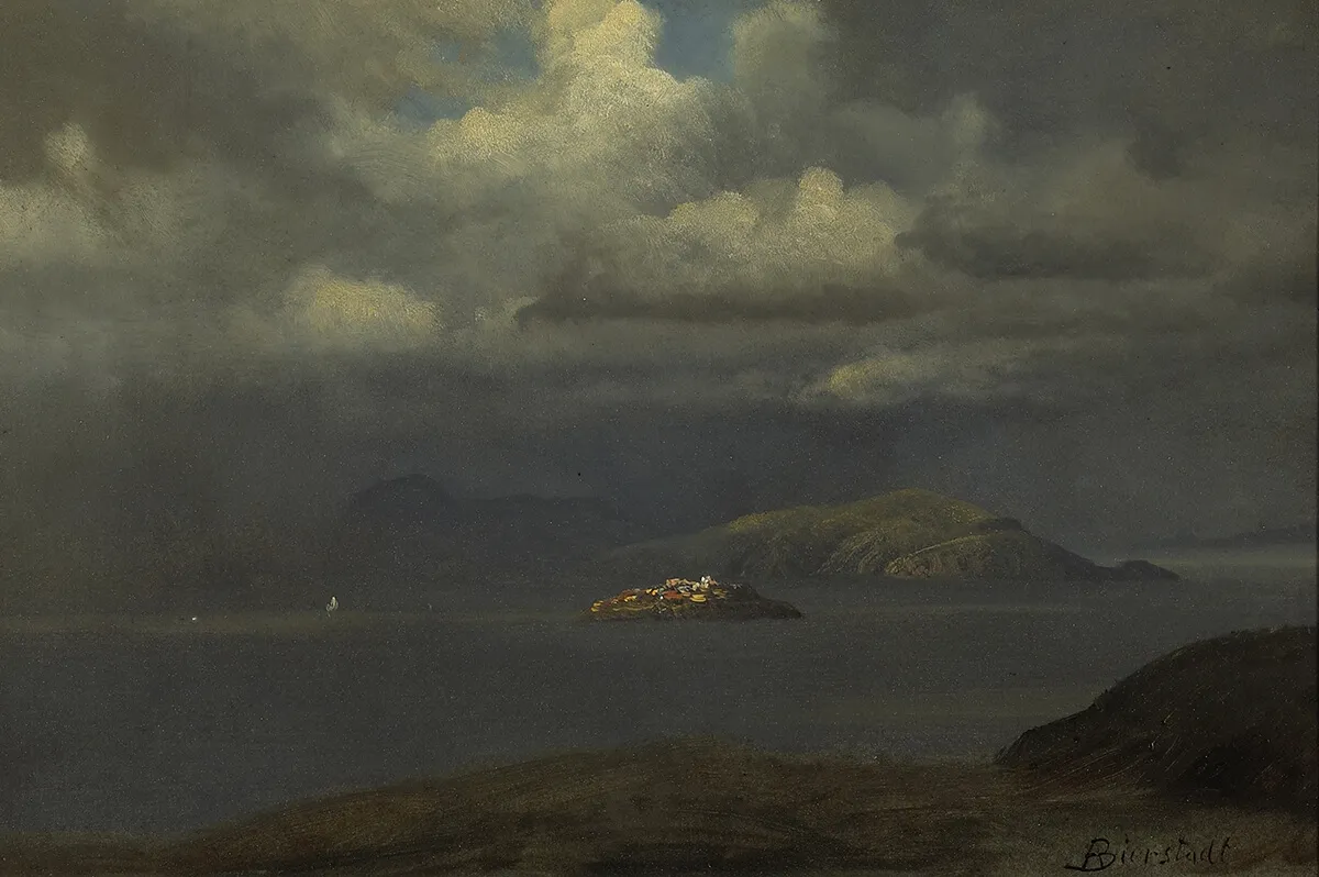 “Alcatraz, San Francisco Bay” by Albert Bierstadt is a captivating oil painting that showcases the historic and picturesque island in the midst of the bay. This artwork presents Bierstadt’s unique departure from his traditional landscapes, as he explores the intersection of nature and human presence.