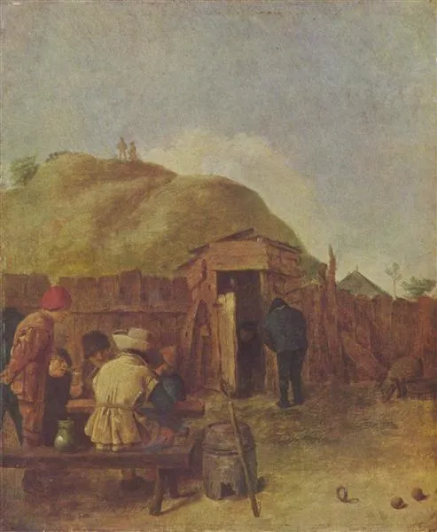 “Drinkers in the Yard” by Adriaen Brouwer is a lively oil painting that captures a scene of revelry and merriment. In this artwork, Brouwer presents a group of peasants gathered together in a rustic yard, engaged in conversation and enjoying their drinks.