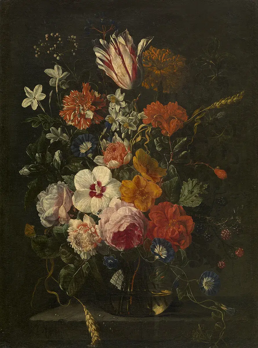 In this captivating artwork, a variety of flowers, including roses, tulips, and lilies, are elegantly arranged in a vase. Mignon’s meticulous brushwork brings each petal and leaf to life, capturing their vibrant colors, textures, and subtle nuances. The composition exudes a sense of beauty, serenity, and the ephemeral nature of life.