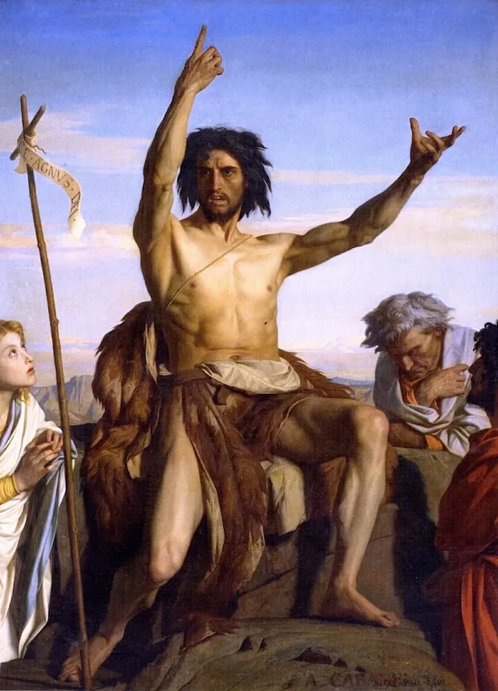 John the Baptist, depicted by Alexandre Cabanel, is a captivating portrayal of the biblical figure known for his role as a prophet and baptizer. Cabanel’s rendition captures the essence of John’s austere and ascetic nature, as he stands in a rugged wilderness, clothed in simple garments and with a flowing mane of hair and beard. His piercing gaze exudes a sense of wisdom and spiritual intensity, conveying the fervor of his message and mission.