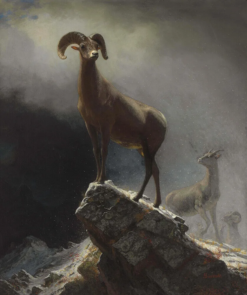 Bierstadt’s artistic brilliance shines through in Rocky Mountain Sheep, Ovis, Montana. The painting features a group of majestic Rocky Mountain sheep, their woolly coats blending seamlessly with the rocky terrain. The artist’s meticulous attention to detail brings the sheep to life, capturing every curve and texture with remarkable precision. The sheep stand proudly, their majestic horns symbolizing strength and resilience amidst the mountains.