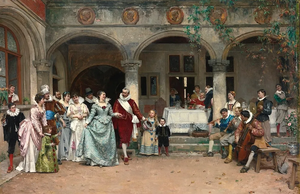“The Silver Wedding” by Adrien Moreau is a captivating oil painting that celebrates the joyous occasion of a couple’s 25th wedding anniversary. The composition showcases a grand celebration, filled with family, friends, and loved ones.