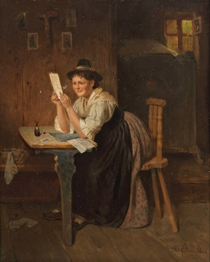 “The Successful Letter” by Adolf Eberle is a captivating oil painting that tells a story of anticipation and triumph. This artwork portrays a moment of joy and relief as a character receives a long-awaited letter, their face lit up with happiness.