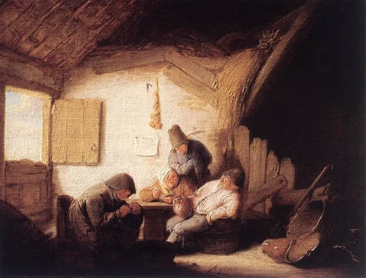 In this vibrant artwork, van Ostade showcases his keen observation of human interaction and everyday life. The painting depicts four figures engaged in various activities within the tavern, from the animated conversation between two men to the serving of drinks by the bartender. Van Ostade’s attention to detail is remarkable, evident in the expressions on each figure’s face, the intricate textures of their clothing, and the warm colors that bring the scene to life.
